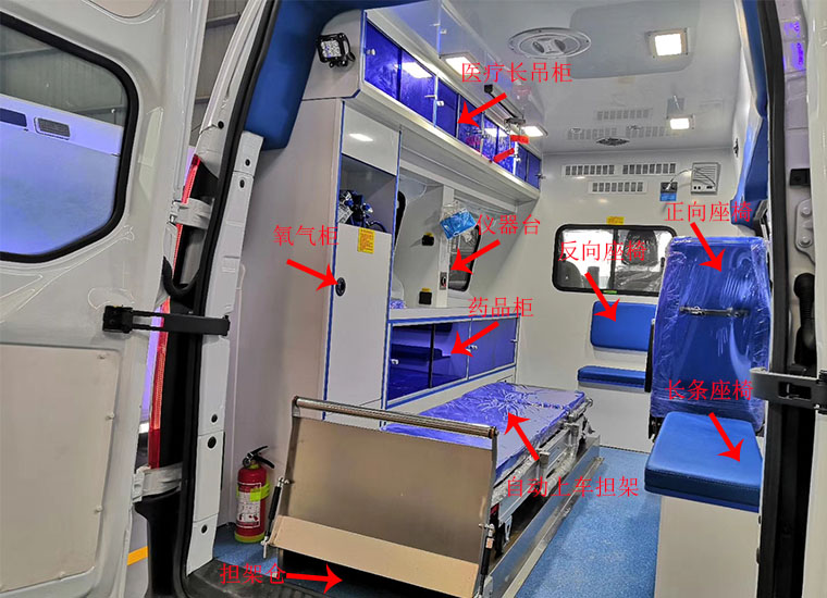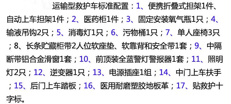 | 其它 | 1.車內裝置藥柜、擔架、氧氣瓶、輸液掛鉤等專用裝置;2.隨底盤選裝中頂時整車高度為2490mm;隨底盤選裝高頂時整車高度為2875mm;3.ABS系統控制器型號:APG3550500G;ABS系統控制器生產企業:浙江亞太機電股份有限公司;發動機最大凈功率83KW;4.隨底盤選裝后踏步板,對應整車長度為5696mm,不選裝后踏步板時對應整車長度為5496mm;隨底盤選裝輪罩蓋,選裝前霧燈,選裝黑色前大燈;6.車身可選裝爆閃燈.車頂可選裝圓柱形爆閃燈. | ||