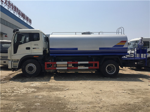 改裝配置:罐體用4MM碳鋼板制作,罐內隔板具有防波作用,以減低汽車行駛時罐體液體的沖擊。整車帶一個專用灑水泵(垂直最大吸程6米),灑水寬度14米,射程28米。多功能灑水車配備2個前沖(噴)(能將路面泥巴、塵土、垃圾沖干凈);2個后灑(能均勻地將水灑在路面,一次灑水寬度14米)、2個側噴(花灑)(能均勻地將路旁綠化帶澆灌)、帶1個后工作平臺,平臺上安裝1個綠化灑水高炮(灑水炮可全方位旋轉,可連續調成直沖狀、大雨、小雨、毛毛雨,霧狀可調節沖洗高大樹木),引水時間<5min,流量90m3/h。帶1個消防接頭,帶1個自流閥,1個過濾裝置、人性化爬梯及側防護欄,安裝灑水音樂喇叭。