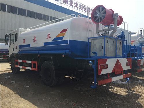 東風天錦灑水車標配前沖(噴)后灑,灑水寬度≥14米,帶側噴,罐體后帶工作平臺,平臺上安裝綠化灑水炮,灑水炮可全方位旋轉,射程≥28米,可連續調成直沖狀、大雨、小雨、毛毛雨,帶安全護欄,配備專用灑水泵,