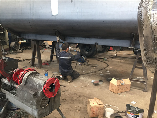 灑水車罐體在焊接工位上采用氣體保護焊接自動焊接而成,保證罐體焊縫質量的原樣性。罐體的長度采用一次成型的整體式縱梁焊接,確保罐體的強度,罐體要進行整體噴丸工藝處理,以消除焊縫應力和整體除銹。