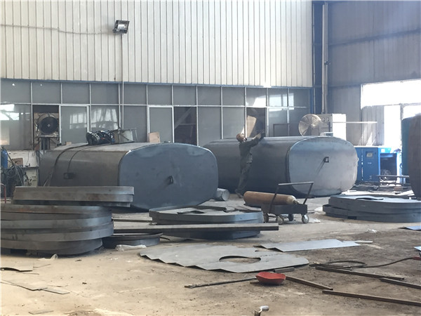 灑水車罐體一般有橢圓形罐和方形罐兩種,在罐體長度、長軸、短軸不超的情況下,適當加大封頭的橢圓系數,能有效增加罐體的容積。采用自動流水線罐體生產工藝分為:下料、拼板自動焊,封頭旋壓成型,罐體一次滾壓成型等國內先進生產工藝。灑水車罐體材料采用Q235B優質碳鋼板生產,厚度分別為5、4、3mm,具體部位為: 翼板―4mm;腹板―4mm;封頭―5mm;隔板―3mm。