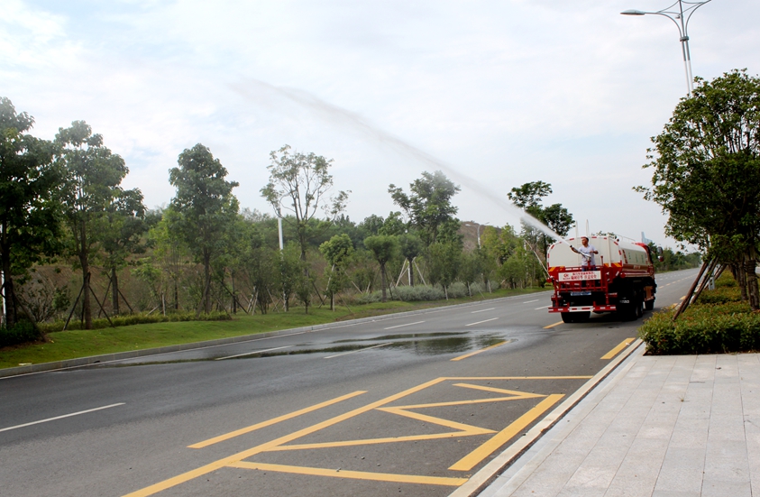 路面保潔采用了環衛管制,城管協同的方式,一方面新購進了灑水車來降塵保潔,一方面用職能部門來制約管理公共環境。