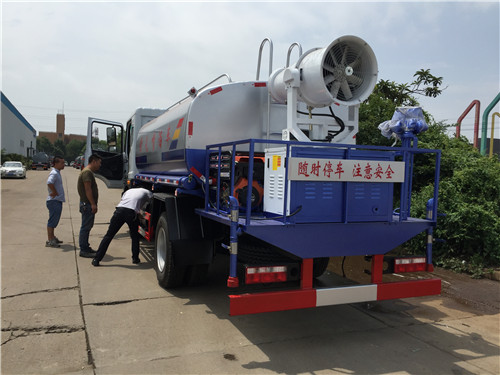 東風12噸灑水車選配50米噴霧機達到除塵效果。霧炮機是根據風送原理,先使用進口高壓泵、微細霧化噴嘴將水霧化,再利用風機風量和風壓將霧化后的水霧送到較遠距離,使得水霧到達較遠距離同時能夠覆蓋更大面積,水霧與粉塵凝結后降落,從而達到降塵目的。