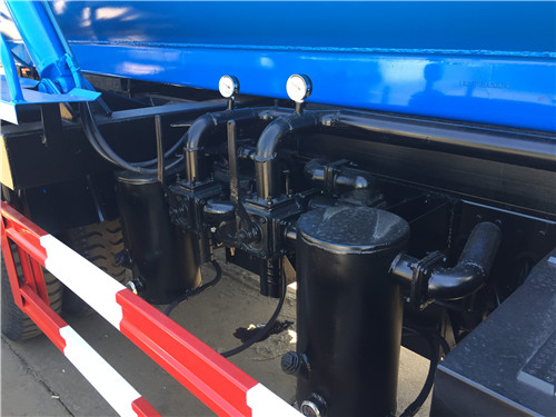 真空泵只能逆時針旋轉(面對車頭看),要從罐體內抽出空氣,或者向罐體內輸入空氣,要利用四通閥來控制。四通閥分別與罐體、真空泵、儲油箱及大氣相通。操作四通閥手柄,改變通道位置,可改變真空泵的吸氣方向。當需要吸污作業時,通過搬動四通閥,將真空泵調整為從罐體內吸氣,則罐內空氣經氣管、水氣分離器、真空泵抽出,并排到外界。罐內氣壓下降,就可以進行吸污作業。反之,通過搬動四通閥,將真空泵調整為從外界吸氣,則外界空氣經真空泵、油水分離器、水汽分離器后進入罐內,。罐內氣壓上升,就可以進行排糞作業。