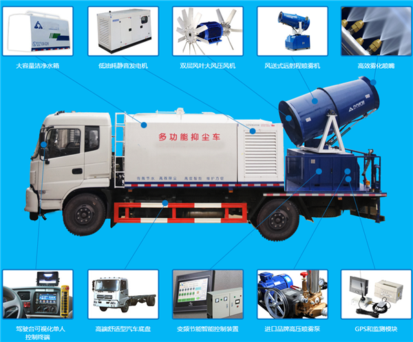 抑塵車選裝配置:威龍泵、30米-120米噴霧機,前置全自動灑水炮、藥盤、藥泵、高壓噴藥設備、多方位進去水龍頭、正常氣動控制、LED箭頭燈、罐體發泡或巖棉保溫層