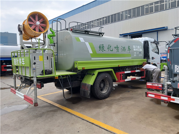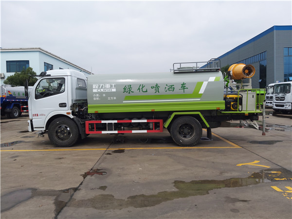 灑水車配置說明:東風多利卡5噸灑水車是一款綠化環衛多功能灑水車,主要適合于城市、小區、工廠的小型綠化環衛用。前沖,后灑,帶側噴、帶后工作平臺、平臺上安裝綠化灑水高炮(高炮可360°旋轉,可連續調成直沖狀、大雨、小雨、毛毛雨),配備專用大功率灑水泵,帶消防接頭,帶自流閥,帶自吸功能。垂直吸程≥6米,灑水寬度≥14米,高炮射程≥28米。