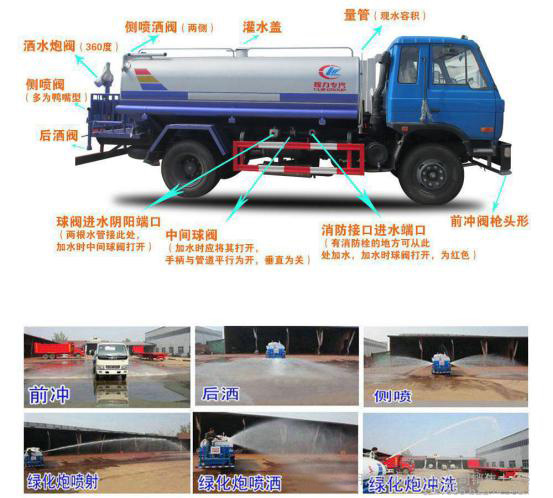 前沖(一般安裝在駕駛室前,也有安裝在駕駛室和罐體之間),后灑、側(cè)噴,后工作平臺并配有綠化灑水炮。綠化灑水炮一般可以調(diào)節(jié)成霧狀、柱狀、毛毛雨、中雨、大雨等。