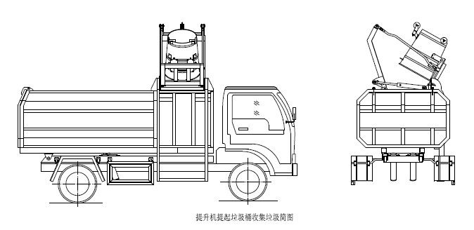 步驟1.首先將垃圾桶放置在提升機的掛鉤處,再將提升或上蓋(選裝)操作手柄推至升起位置,箱體右側提升機油缸或頂端上蓋開蓋油缸伸出,使提升機帶動垃圾桶向上升起并旋轉翻倒垃圾,垃圾進入箱體。松開操作手柄使其回到中位;如圖: